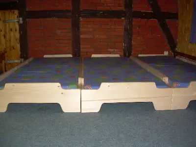 zwei Schlafräume mit Stapelbetten, Decken und Kissen zur individuellen Nutzung