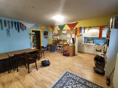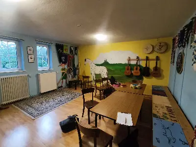 Küche mit Kühlschrank und Herd (Ofen funktioniert nur, wenn nicht noch zusätzliche Stromfresser angeschlossen sind). Kleines Klo. Solltet ihr eine größere Gruppe sein, können wir auch größere Räume in der Gemeinde anfragen. Eine Dusche ist auf Anfrage nutzbar in der Pilgerherberge.